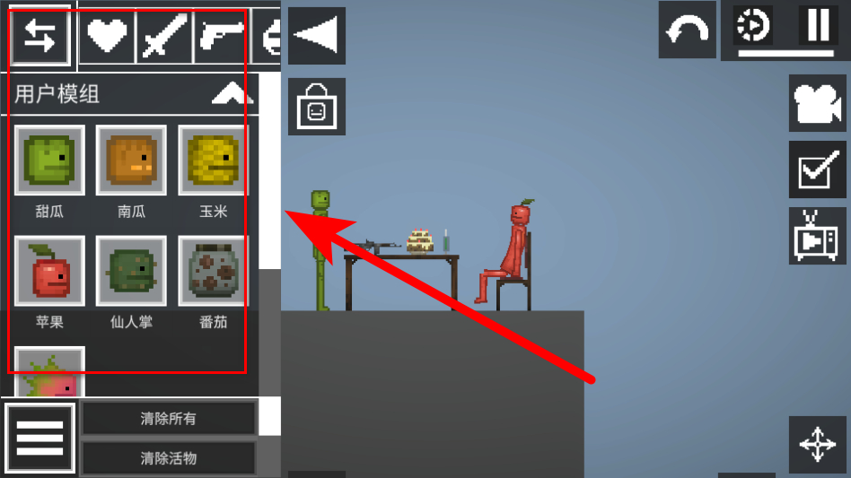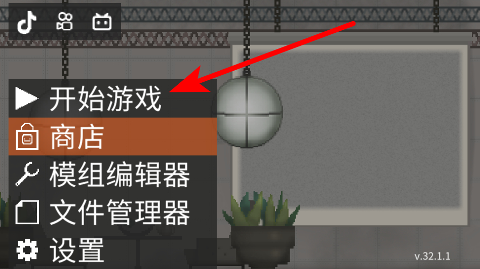 3、進(jìn)入游戲場(chǎng)景后,點(diǎn)擊左上角的功能菜單按鈕,打開(kāi)道具與模組選擇界面。