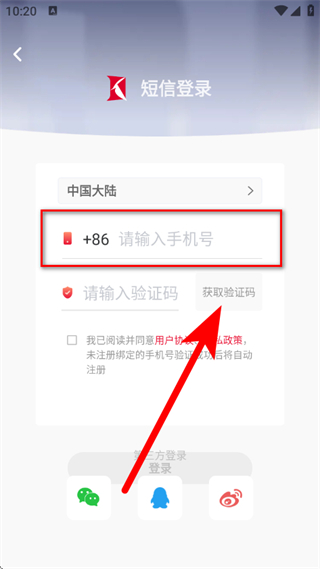 3、在短信登錄頁(yè)面,輸入手機(jī)號(hào),點(diǎn)擊獲取驗(yàn)證碼。