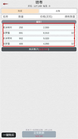 3、打開坊市系統(tǒng),可以購買材料,用于輔助修煉。