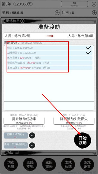 2、確認(rèn)角色渡劫要求達標(biāo),點擊開始渡劫完成突破。