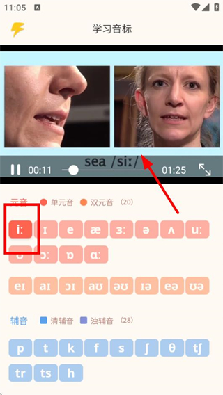 3、在學習音標頁面,可觀看音標教學視頻并選擇對應音標進行學習。