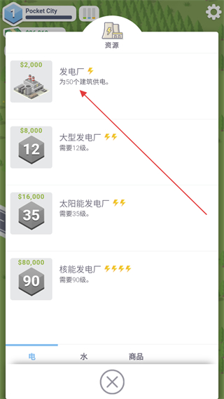 3、點(diǎn)擊資源建造列表,點(diǎn)擊選擇發(fā)電廠和水塔花費(fèi)金錢進(jìn)行建造。