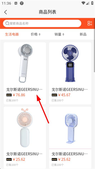 2、在分類頁面,選擇生活電器選項(xiàng),進(jìn)入生活電器的商品列表頁面。