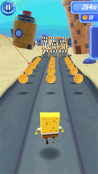 2、需要左右滑動屏幕,讓海綿寶寶在三條道路上移動收集金幣。