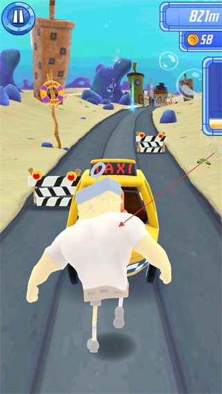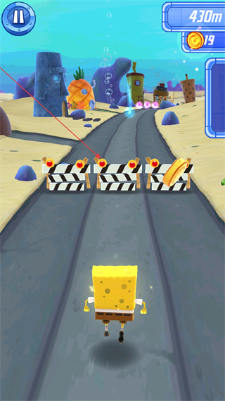 4、獲取道路上的道具可以獲得不同效果,比如海綿寶寶變大無視任何障礙等。