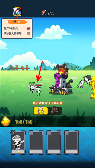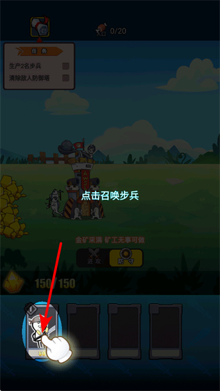 1、進(jìn)入游戲點(diǎn)擊界面下方的步兵圖標(biāo),可召喚步兵單位,滿足生產(chǎn)2名步兵要求。