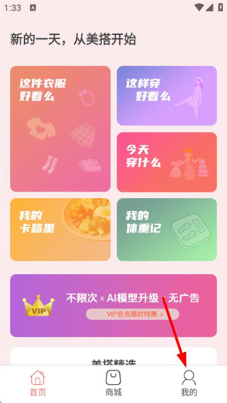 1、在美搭首頁(yè),點(diǎn)擊底部的我的選項(xiàng),進(jìn)入個(gè)人中心頁(yè)面。