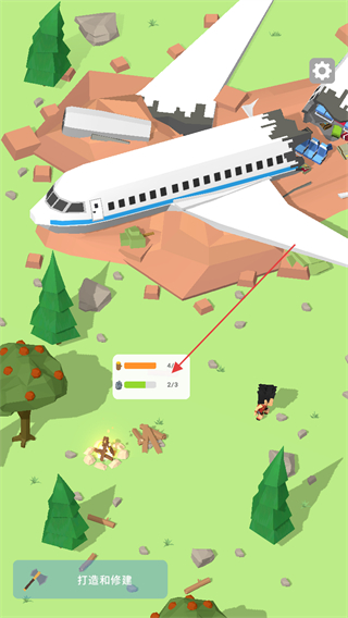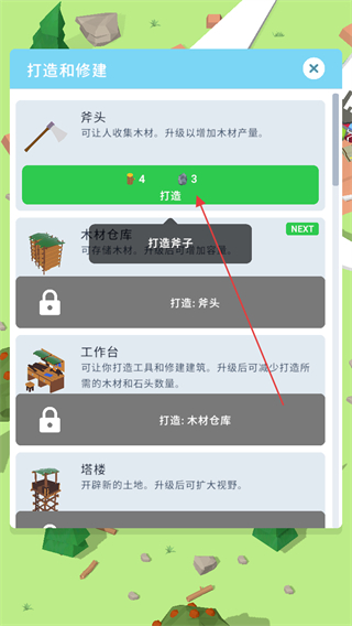 1、在打造和修建界面,消耗資源點擊打造按鈕,獲取斧頭工具,用于收集木材。