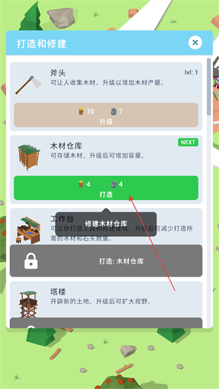 1、在打造和修建界面,消耗資源點擊打造按鈕,獲取木材倉庫,用于存儲木材。