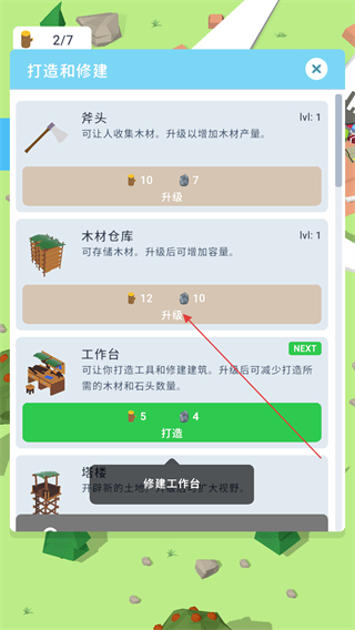 4、在打造和修建界面,消耗資源點擊打造,獲取工作臺,解鎖更多打造選項。