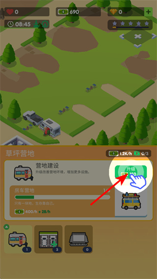 2、游戲中點擊房車旁的互動區(qū)域,可觸發(fā)與房車的交互操作,解鎖對應(yīng)的營地資源如獲得690金幣。