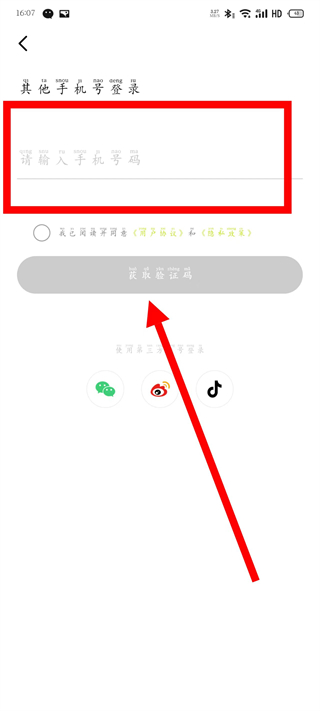 3、在登錄頁面,輸入手機(jī)號(hào)碼,勾選協(xié)議后,點(diǎn)擊獲取驗(yàn)證碼。