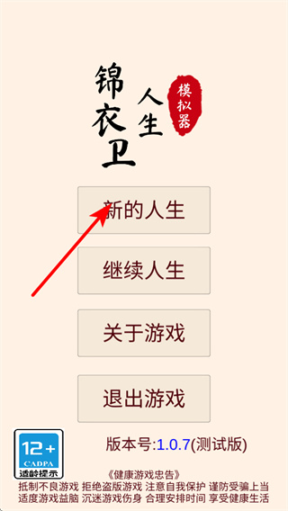 1、開啟游戲,點擊新的人生按鈕,可開啟錦衣衛(wèi)人生的全新流程,進入游戲的核心玩法。