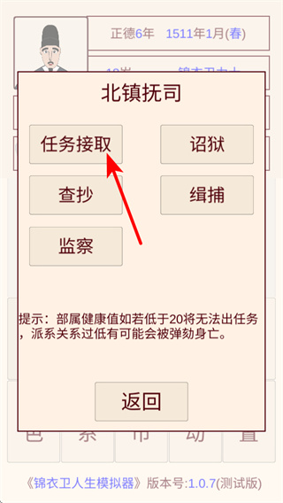 2、游戲中在北鎮(zhèn)撫司界面點擊任務(wù)接取按鈕,可獲取對應(yīng)的任務(wù),推進角色的職務(wù)進程。