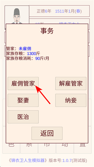 3、按照箭頭指引,在事務(wù)界面點擊雇傭管家按鈕,可招募管家協(xié)助管理家族事務(wù),降低壓力。