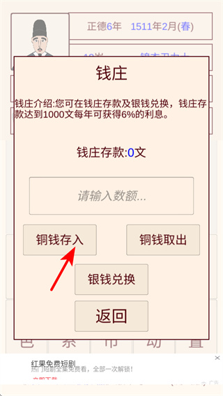 4、在錢莊界面點擊銅錢存入按鈕,可將銅錢存入錢莊獲取利息,積累游戲內(nèi)的貨幣資源。