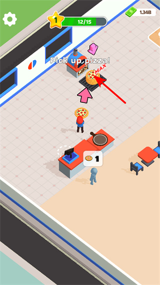 2、游戲中操控角色靠近箭頭指向的披薩,拾取制作好的披薩,完成配送流程來(lái)積累升級(jí)所需的資源。