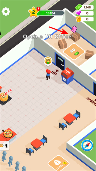 4、在場(chǎng)景內(nèi)點(diǎn)擊箭頭指向的區(qū)域,消耗資源開(kāi)啟HR Office,解鎖人員管理相關(guān)功能,輔助后續(xù)的升級(jí)。
