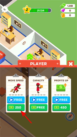 1、進(jìn)入游戲后在PLAYER界面點(diǎn)擊MOVE SPEED對(duì)應(yīng)的資源按鈕,消耗資源升級(jí)角色移動(dòng)速度,提升效率。