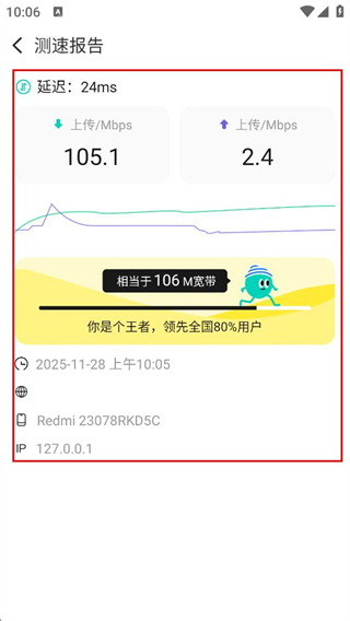 4、測速完成后,查看生成的測速報告,獲取網(wǎng)絡(luò)延遲、上傳速度等信息。
