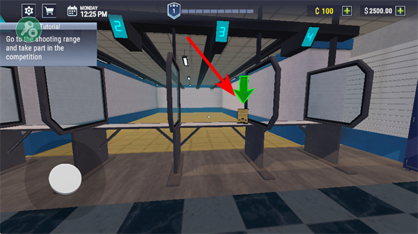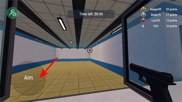3、按照箭頭指引,操控瞄準區(qū)域對準靶標,完成射擊操作來積累競賽積分,提升排名。