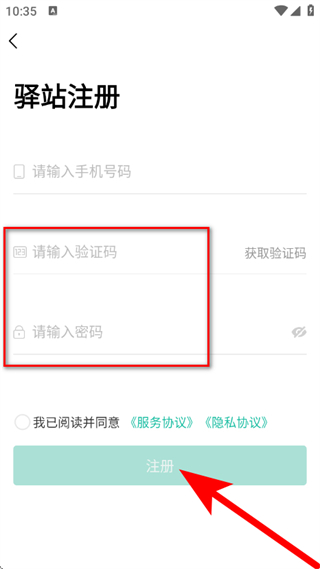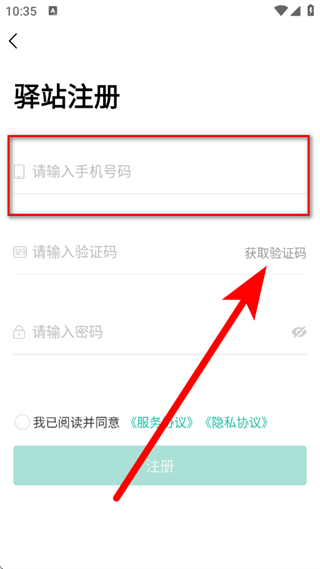 3、在驛站注冊(cè)頁(yè)面,輸入手機(jī)號(hào)碼,點(diǎn)擊獲取驗(yàn)證碼。