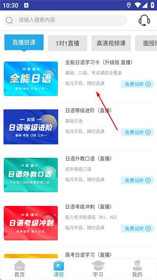 1、在未名天日語的首頁(yè),點(diǎn)擊底部的課程選項(xiàng),進(jìn)入課程列表頁(yè)面。