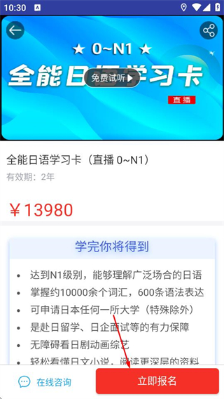5、在購(gòu)買頁(yè)面,點(diǎn)擊立即報(bào)名,即可完成該課程的購(gòu)買報(bào)名。