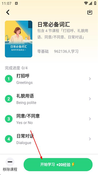 4、在課程詳情頁面,點(diǎn)擊開始學(xué)習(xí),即可進(jìn)入課程學(xué)習(xí)環(huán)節(jié)。