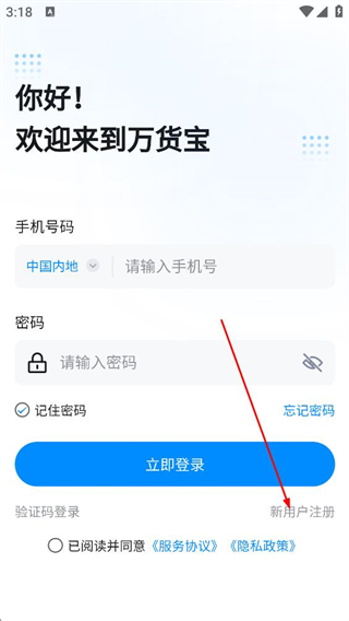 3、在登錄頁面,點擊新用戶注冊,進入萬貨寶注冊頁面。