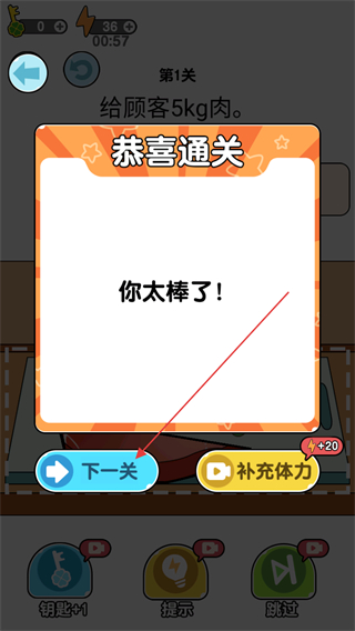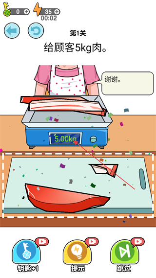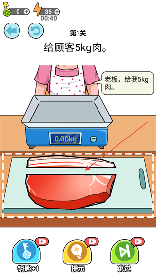 1、根據(jù)關(guān)卡要求給顧客5kg肉,在虛線范圍內(nèi)切割肉塊。