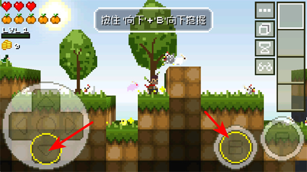 4、同時按住向下方向鍵和B按鍵,可操控角色向下挖掘方塊,獲取泥土以推進生存建設(shè)。