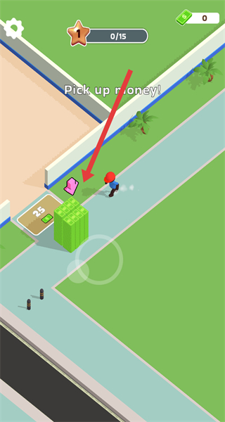 1、在游戲初始界面,滑動屏幕操控角色拾取場地內的金錢,積累初始資金。