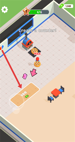 3、制作好披薩后,操控角色移動到目標點上創(chuàng)建柜臺,完善店鋪設施。
