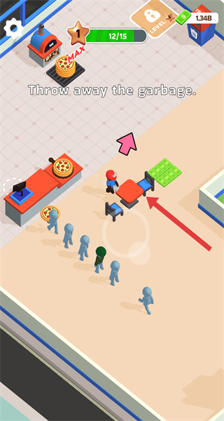 4、當顧客用餐完畢后,移動角色處理餐后垃圾,保持店鋪運營秩序,推進游戲進度。