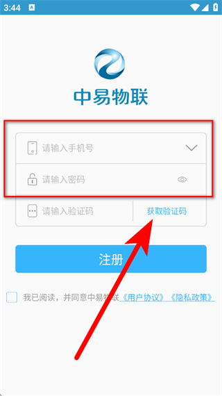 3、在注冊頁面,輸入手機(jī)號(hào),設(shè)置密碼后,點(diǎn)擊獲取驗(yàn)證碼。