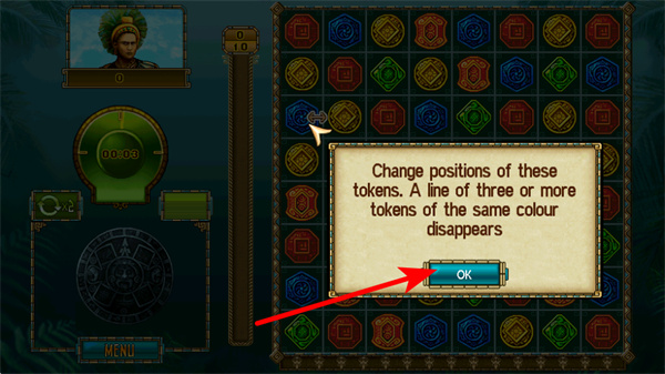 1、先點擊OK按鈕確認規(guī)則提示,通過交換相鄰代幣的位置,讓3個及以上同顏色代幣連成一線,消除代幣推進關卡。