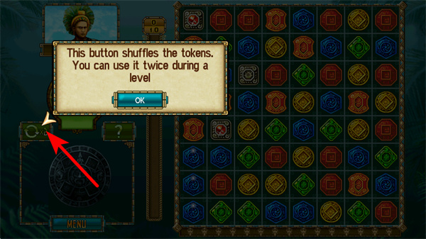 3、按照箭頭指引,點擊左側的洗牌按鈕,可打亂當前所有代幣的位置每關限用2次,重新構建可消除的代幣組合。