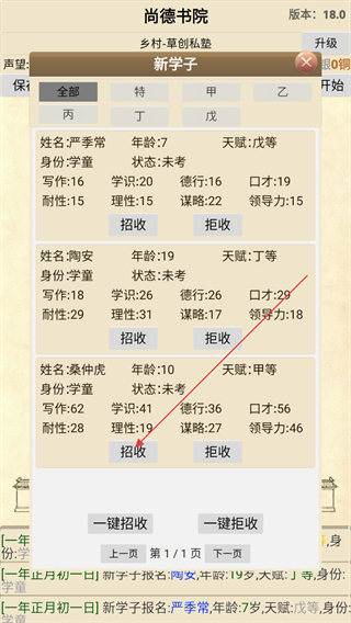 2、在下方學(xué)子列表中可以根據(jù)天賦以及其他屬性選擇學(xué)子,點擊下方的招收按鈕即可。