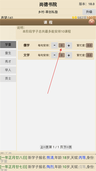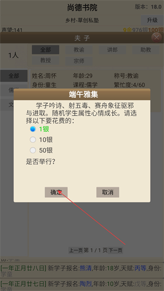 4、書院內(nèi)會不定時舉辦一些活動,提高學(xué)子的各項屬性,點擊下方確定按鈕選擇花費(fèi)的銀子數(shù)量進(jìn)行舉辦。
