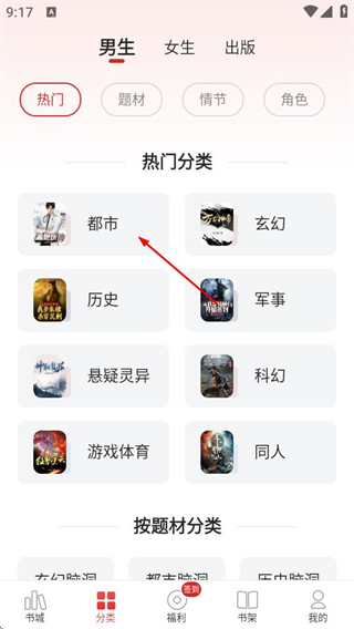 2、在分類頁面,點(diǎn)擊都市分類,進(jìn)入都市類小說列表頁面