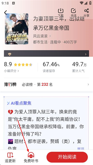 4、在小說詳情頁面,點(diǎn)擊免費(fèi)聽書,即可使用聽書功能收聽本書。