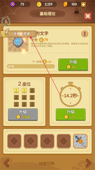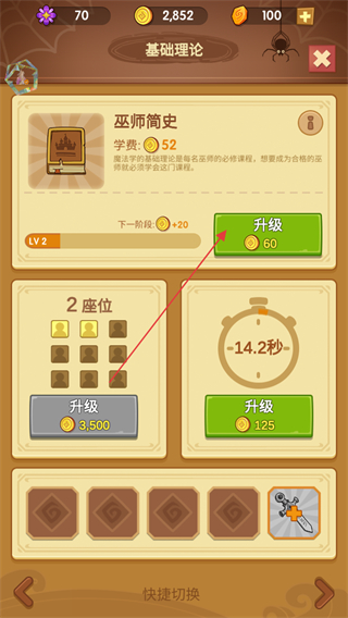 2、進入基礎理論界面,點擊巫師簡史右側(cè)的升級按鈕,消耗金幣提升課程等級。