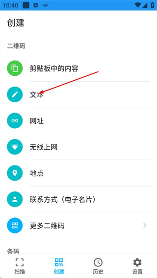 1、在掃描二維碼/條形碼頁(yè)面,點(diǎn)擊底部的創(chuàng)建,進(jìn)入創(chuàng)建功能頁(yè)面。