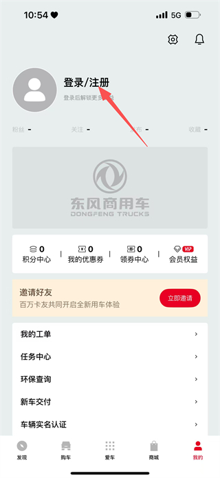 2、在個人中心頁面,點擊登錄/注冊,進入東風商用車登錄頁面。