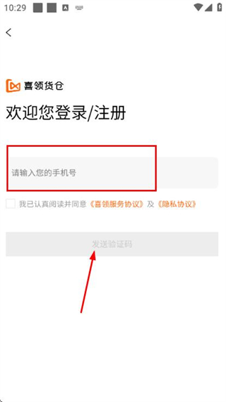 4、在登錄注冊頁面填寫手機號,勾選協(xié)議后點擊發(fā)送驗證碼。