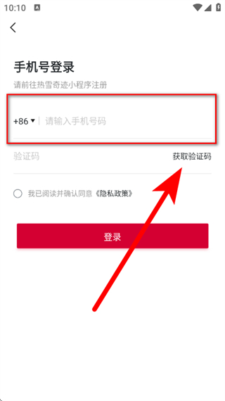 3、在手機號登錄頁面,輸入手機號碼,點擊獲取驗證碼。