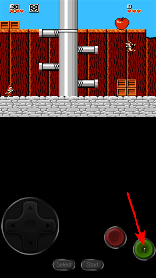 2、游戲中依照箭頭指引,點(diǎn)擊綠色A按鈕,可觸發(fā)角色的跳躍動(dòng)作,跨越障礙到達(dá)高處平臺(tái)。