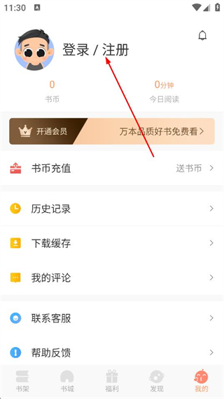 1、在漫畫書城首頁,點擊底部導(dǎo)航欄的我的,進(jìn)入個人中心頁面。