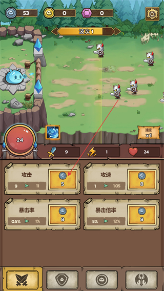1、進(jìn)入游戲關(guān)卡內(nèi)后,點(diǎn)擊下方史萊姆屬性按鈕花費(fèi)銀幣升級(jí)史萊姆的能力。